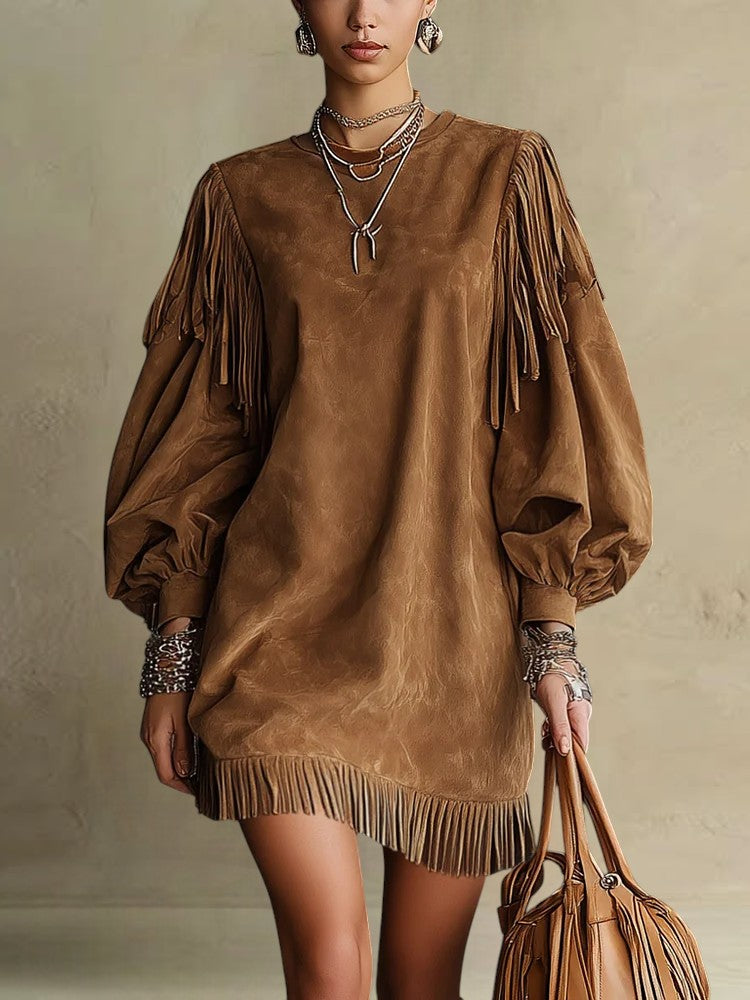 La Emma | Robe Mini en Suède apporte une touche Western ludique à un style contemporain raffiné. Confectionnée en douce suède synthétique avec une finition inspirée du vintage, elle allie confiance féminine et mouvement sans effort. Des manches bouffantes romantiques et des détails de franges délicates ajoutent une touche artistique, tandis que la silhouette décontractée met en valeur avec grâce. Un choix magnifique pour les sorties d'automne, les escapades du week-end ou les soirées marquantes — audacieuse, élégante, et magnifiquement unique.